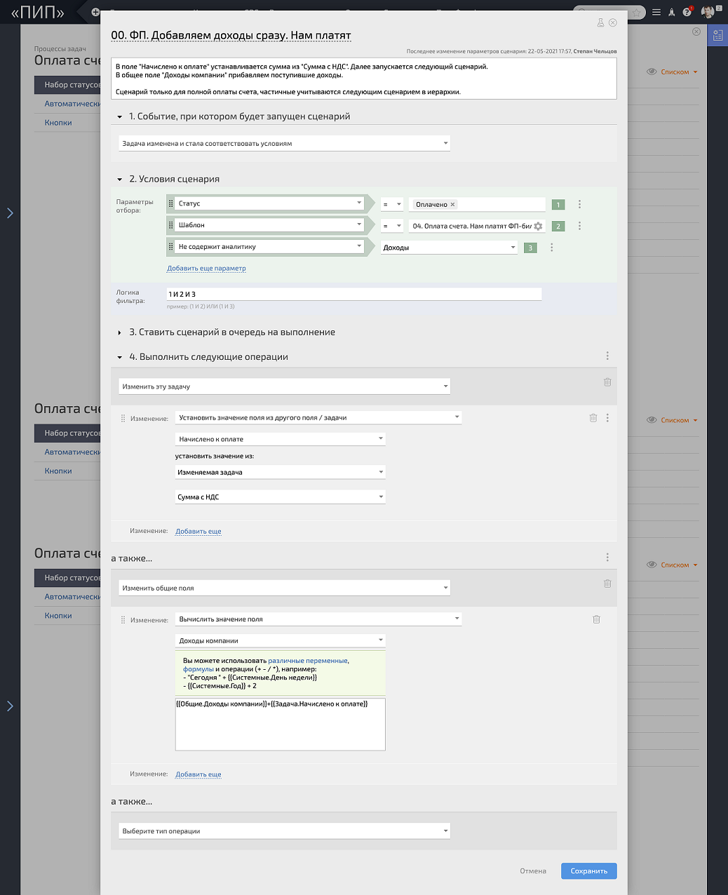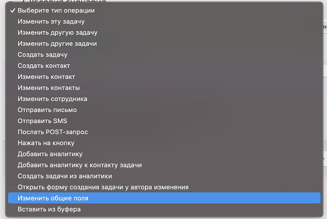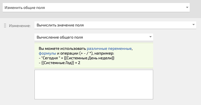 Раскрыть полезность Общих полей помогла недавняя доработка с вычислениями, которая позволяет провести изменение Общего поля. Это действие в сценарии задач и контактов в блоке № 4: